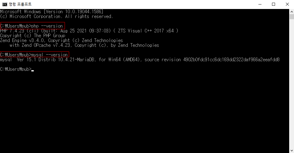 3. 명령 프롬프트(cmd) or git bash 켠 후 아래 두개의 명령어를 통해 버전이 확인되는지 확인.