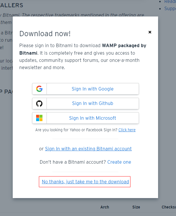 3. 다운로드를 클릭하면 아래의 로그인,가입 모달창이 뜨는데 우린 회원가입이 아닌 WAMP 패키지만 설치 할 것이기 때문에 제일 하단의 No,tanks,just take me to the download 선택하여 다운로드만 진행