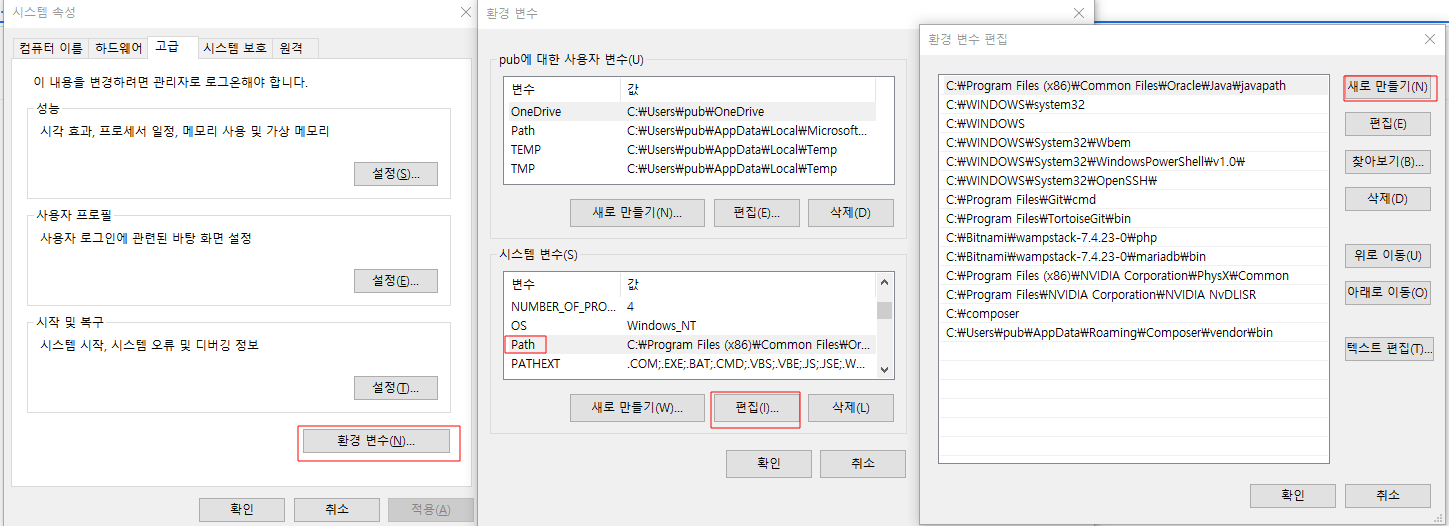 1.시스템 고급설정을 켠 후 왼쪽순서대로 네모박스 표시한 부분을 선택한 후 클릭 '환경변수편집 -> 새로만들기' 까지 진입함.