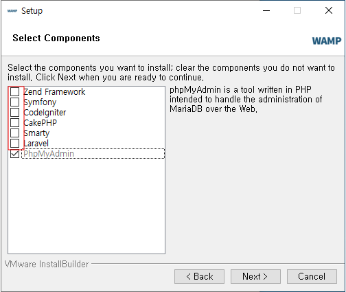 체크해제 할 수없는 PhpMyAdmin을 제외한 다른 체크박스는 전부 해제.
