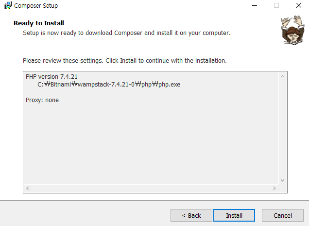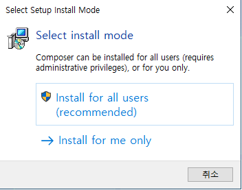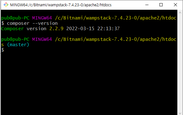 3. 설치가 모두 끝났다면 아래의 명령어를통해 명령프롬프트(cmd) or git bash에서 composer 버전을 확인.