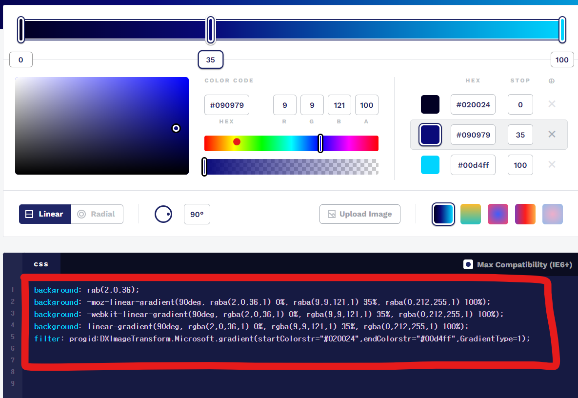 위의 툴을 이용하면 원하는 그라디언트의 색상,각도,위치를 선택하면 자동으로 크로스브라우징까지 대응해주는 코드를 만들어준다.
