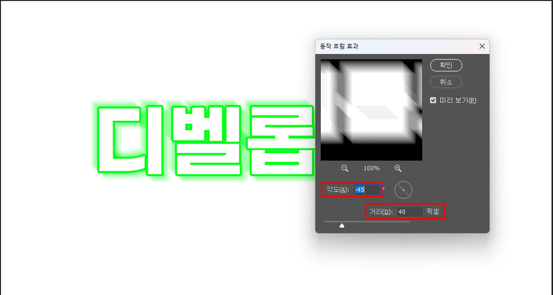 *각도는 -45도 로 설정해줬고, 거리는 40px로 설정해줬다. 거리 값을 조절 할 수록 동작 흐림 효과가 더 극대화 된다.