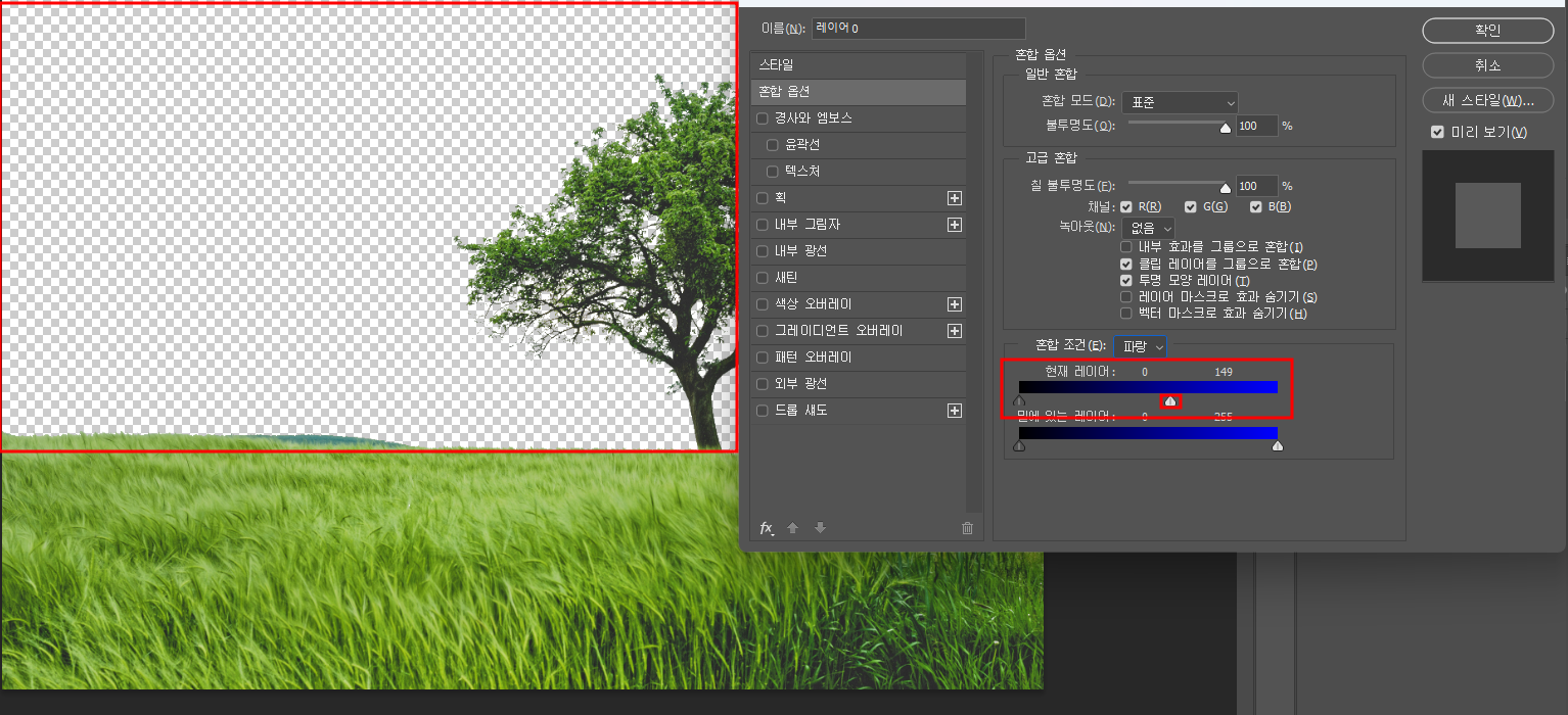 - '혼합 옵션' 레이어 스타일 창에서 혼합 조건 셀렉트 박스를 파랑으로 설정하고 현재 레이어의 우측 화살표를 드래그하여 좌측으로 이동.